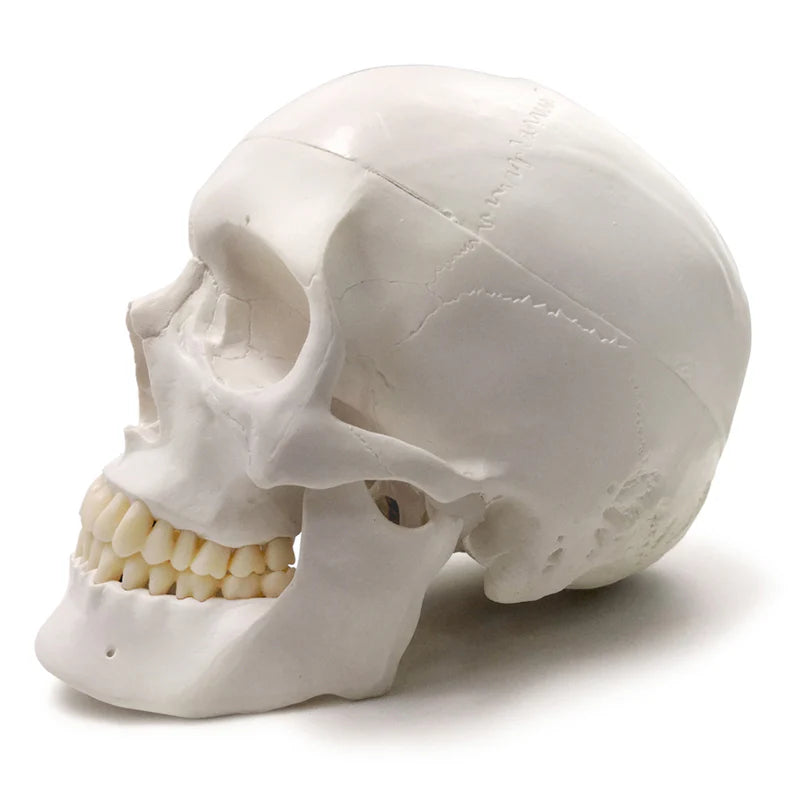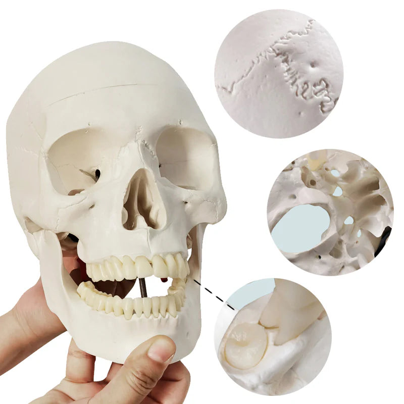 - კომპონენტები: თავის ქალა + მოძრავი ქვედა ყბა